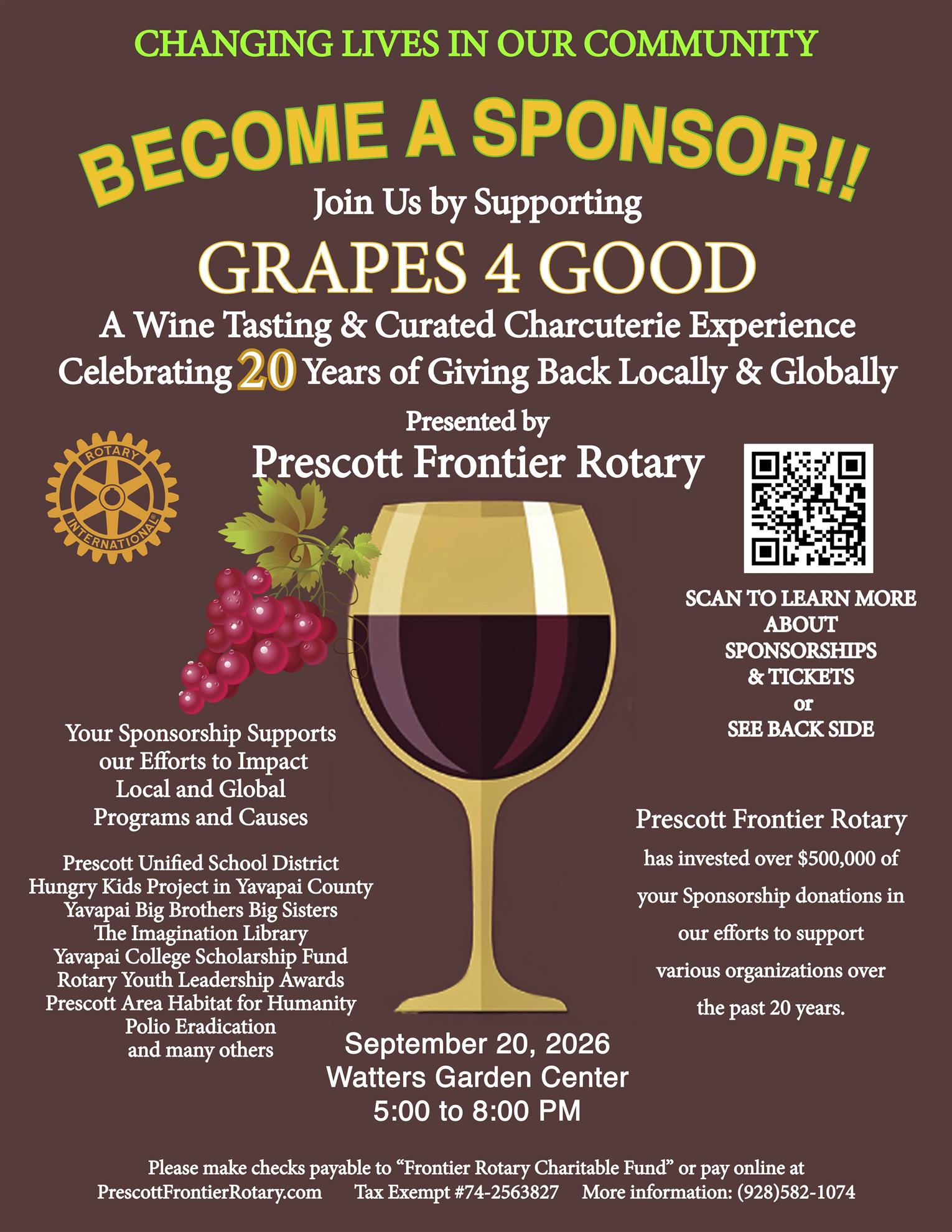 Prescott Frontier Rotary is proud to announce the return of our signature fundraising event, Grapes 4 Good, on September 20, 2026, from 5:00–8:00 PM at Watters Garden Center. This year’s celebration is especially meaningful as we mark 20 years of Grapes 4 Good and two decades of making a lasting impact in our community and beyond.